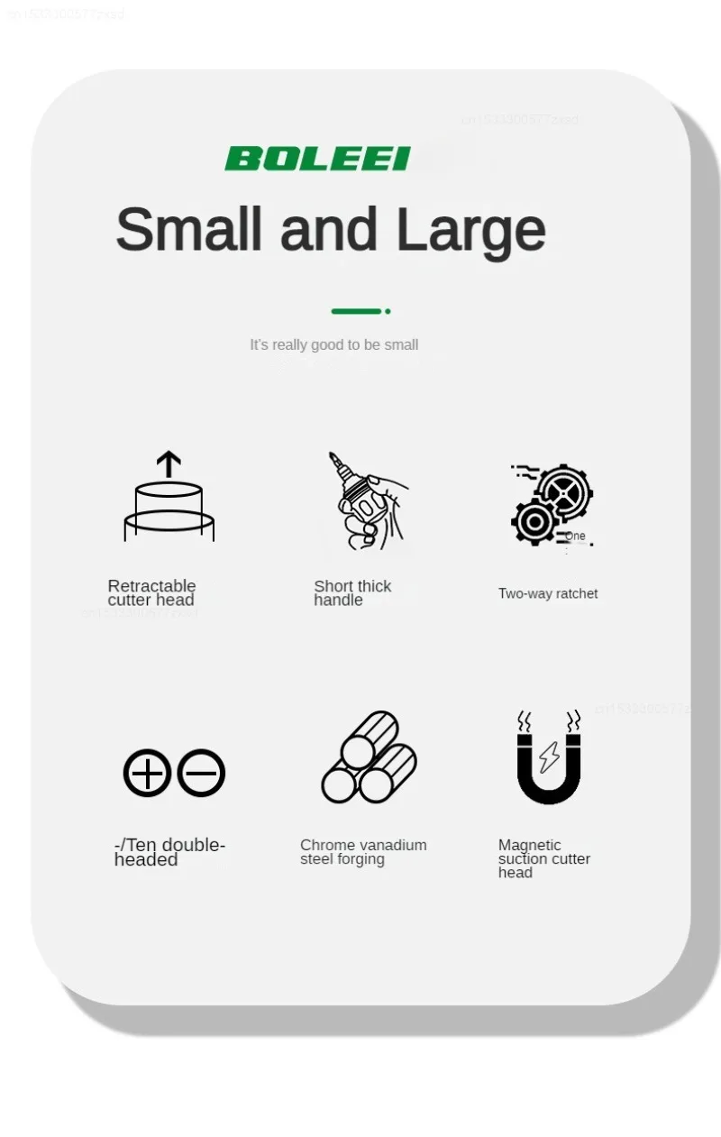 A small figure is of great use. 1. Retractable blade 2. Short and thick handle 3. Bidirectional ratchet 4. Double end use 5. Forged with chrome vanadium steel 6. Magnetic suction blade